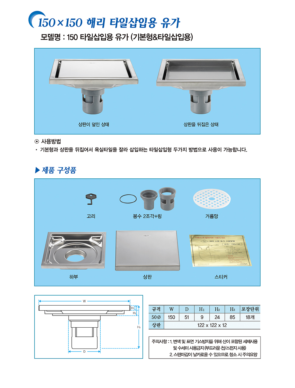 150 x 150 해리 타일삽입용 유가(기본형&타일삽입용)